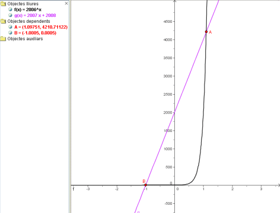 En la pràctica anterior se us ha proposat que adeqüéssiu els eixos per estudiar quants punts comuns tenen les gràfiques de les funcions f(x)=2006^x i g(x)=2007x+2008. Segurament ja heu trobat la solució, i també és ben probable que ja hagueu experimentat per què, a més de saber respondre la qüestió de quants punts comuns?, pugueu dir ràpidament quins són els punts comuns?