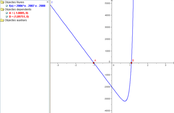 Ara bé, per resoldre aquesta equació també es pot analitzar la funció F(x) = 2006^x - 2007x − 2008 i estudiar quins són els punts en què talla l'eix de les x. Aquest és el procediment que es reflecteix en la propera imatge: