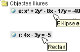 Feu altres proves amb rectes i còniques que podeu entrar a la finestra algebraica redefinint la que us interessi; tanmateix, l'estudi de les còniques s'aprofundirà en el mòdul següent.
