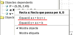 Si teniu oberta la Finestra algebraica, podeu veure que hi apareix l'equació de la recta en forma paramètrica. Si us situeu sobre l'equació de la recta i cliqueu el botó dret del ratolí, veureu que s'obre una finestra que permet canviar el tipus d'equació de la recta a General o Explícita