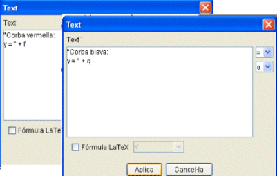 Després de definir els dos textos anteriors situeu-los al lloc que cregueu convenient de la zona gràfica (clicant amb el botó esquerre els podeu situar a mà) i doneu-los els aspectes de presentació que us interessi. Ho heu de fer, com ja sabeu, amb el botó dret i Propietats; a l'exemple s'ha variat el color, s'ha fet que el text aparegui en negreta i s'ha augmentat la mida a 14 punts.
