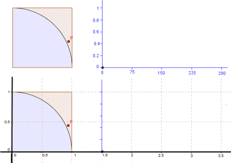 "Entreu" a la finestra activa següent, tot recordant que amb la icona d'actualització, o amb F9 o Ctrl+R, podreu anar fent noves eleccions del punt, i compteu la proporció de vegades que el punt cau dintre del quadrant del cercle acolorit.