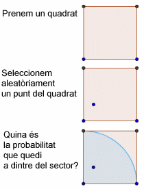 Ànim! Practiqueu en la finestra següent on podreu observar, gràficament, que la freqüència relativa de l'esdeveniment quedar el punt escollit dins del quadrant de cercle tendeix a π/4, que és la probabilitat que això passi.