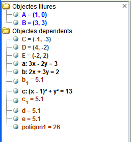 Noteu que les rectes són invisibles, però les seves equacions continuen a la finestra algebraica. Si voleu fer visibles un altre cop les rectes, podeu repetir la mateixa acció, però ara actuant sobre les equacions i així reactivar l'opció.